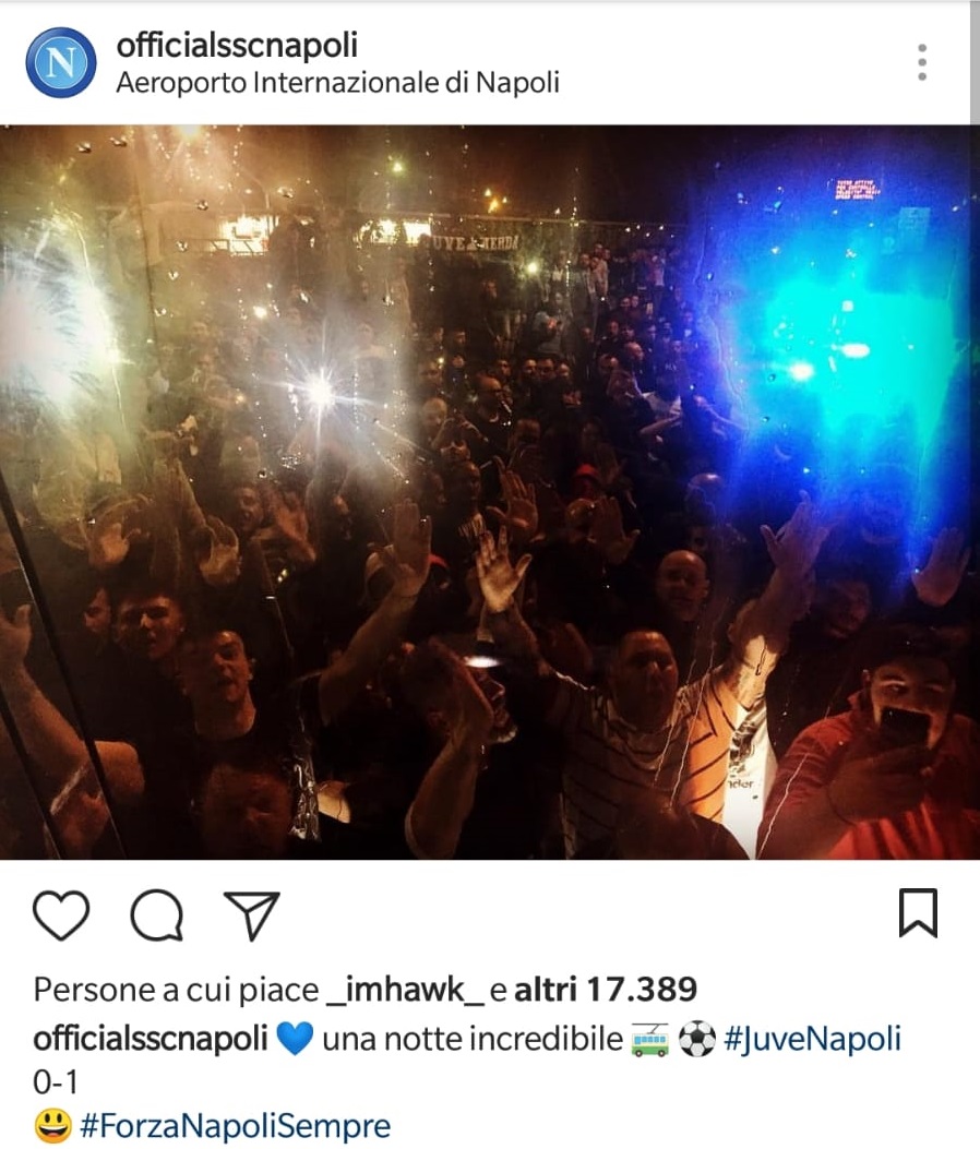 Aeroporto di Capodichino – Fumogeni, fuochi d’artificio, cori e bandiere. Così si presentava Napoli ieri al triplice fischio dell’arbitro che decreta la fine della partita Juve-Napoli.