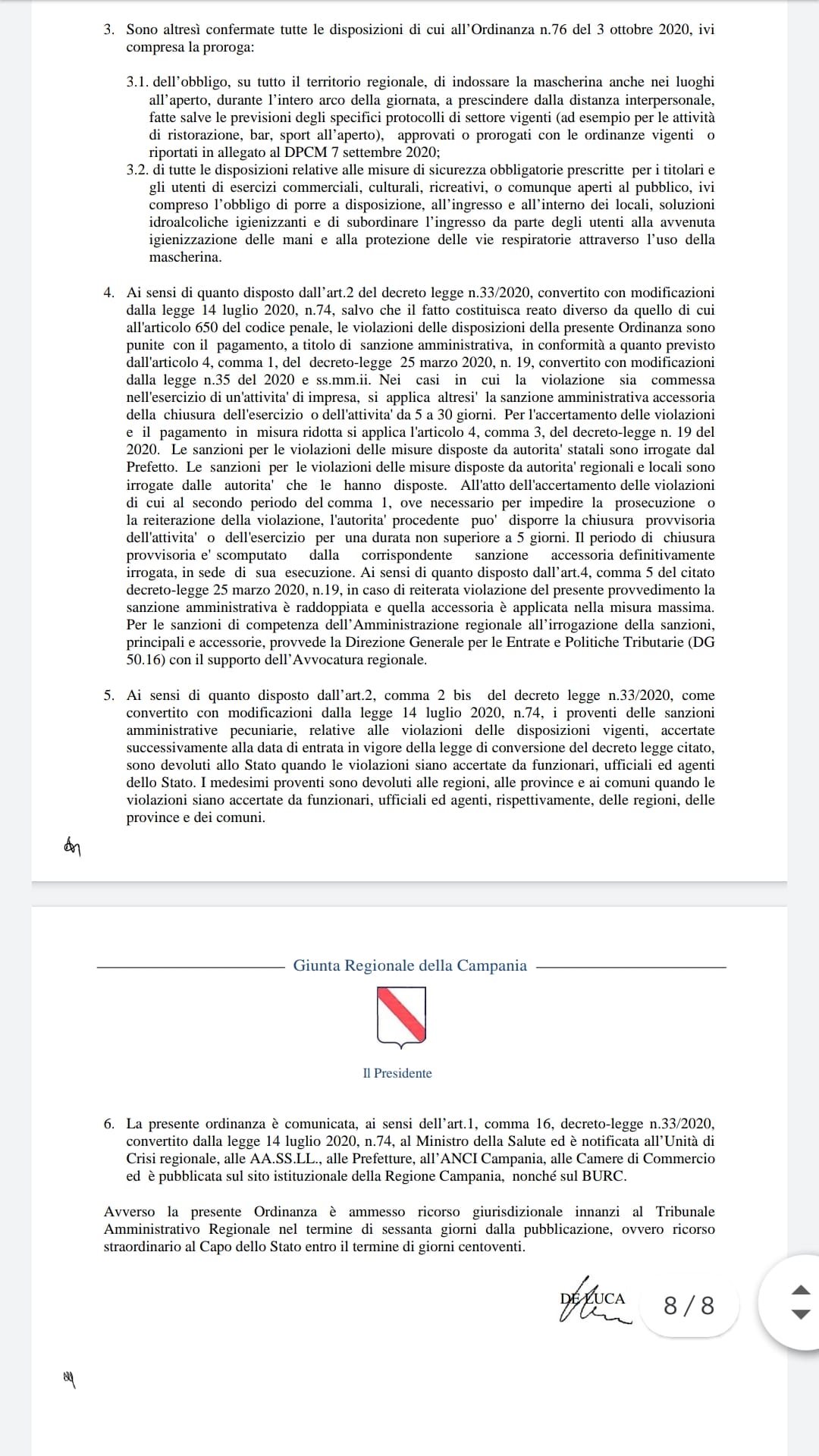 Con questa ordinanza “a sorpresa” il Presidente De Luca anticipa il Governo: pare, infatti, che fra poche ore Plazzo Chigi emanerà un Dpcm molto simile. Anche il provvedimento di Conte prevederà un “coprifuoco”: chiusura dei locali alle ore 23 e obbligo di mascherina all’aperto ( già obbligatoria in Campania).