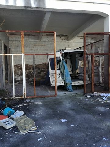 Dalle foto è possibile costatare che i locali della ex struttura sanitaria versano in uno stato di degrado e di completo abbandono: sul pavimento sono abbandonati diversi classificatori contenenti perizie mediche certificati e cartelle cliniche, insieme a indumenti e tute arancioni utilizzate dal personale sanitario. Nello spazio antistante l’edificio, erano presenti due ambulanze con le targhe montate sul paraurti e parzialmente ridotte a carcasse.