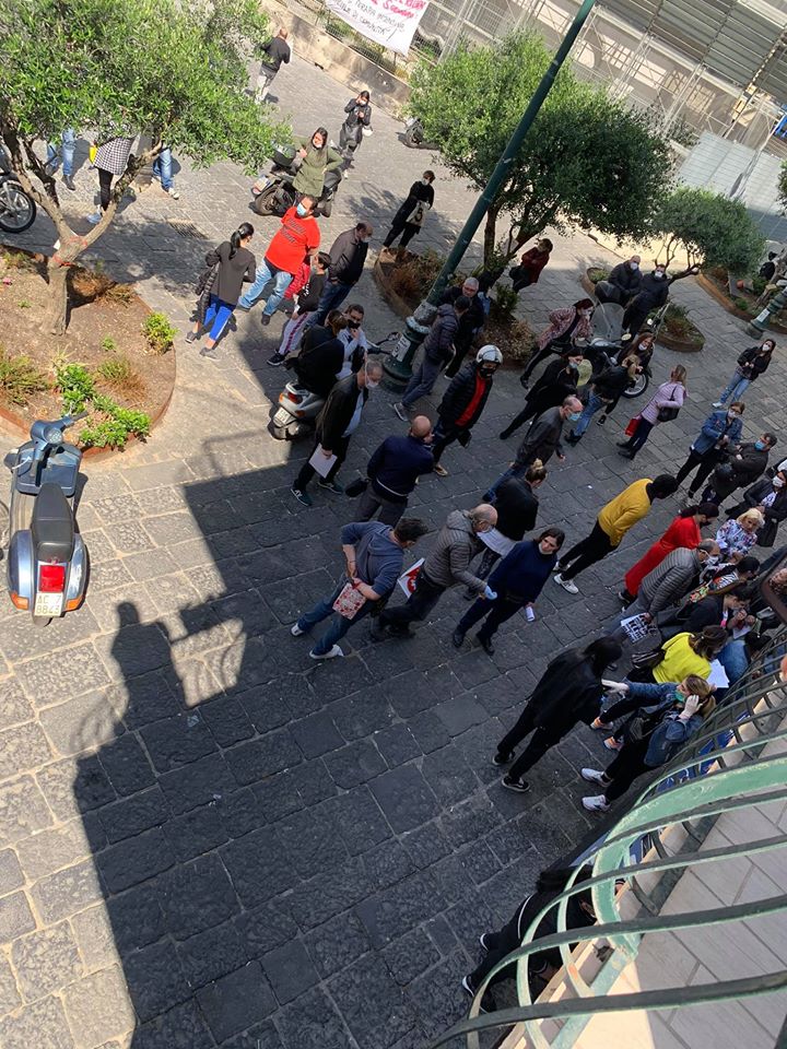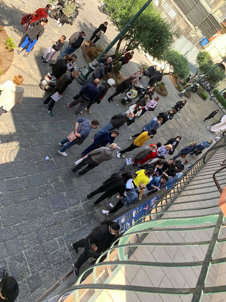 Sul gruppo Facebook “Sei del Rione Sanità se..”, poco dopo le 10.00 di questa mattina, sono state rese pubbliche le foto all’esterno del Caf. Sono decine le persone in fila, in attesa di entrare, molte delle quali non rispettano le distanze di sicurezza. Si notano, tra la folla, alcuni che non possiedono i DPI ( dispositivi di protezione individuali), quali mascherine e/o guanti.