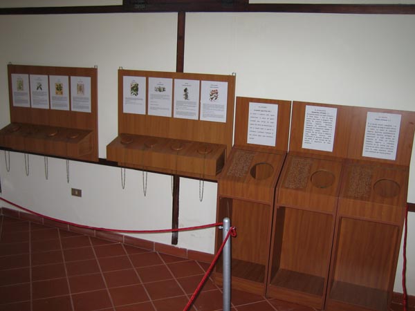 Il compartimento superiore di ogni teca contiene il materiale vegetale esposto, ed è fornita di un foro attraverso il quale l’utente può percepire al tatto le particolari caratteristiche degli organi vegetali presenti e, nel caso in cui siano esposte parti odorose di piante, adoperare anche l’olfatto; mentre, sulla superficie posta lateralmente al foro, è presente un testo sintetico in caratteri braille, riportante le informazioni relative al materiale vegetale contenuto nella teca.