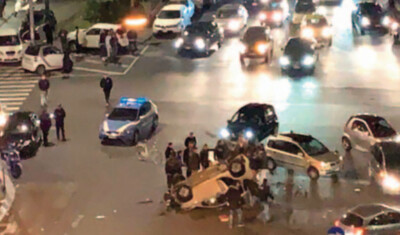 Difatti l’auto si è ribaltata all’improvviso durante la sua corsa intorno alla piazza.