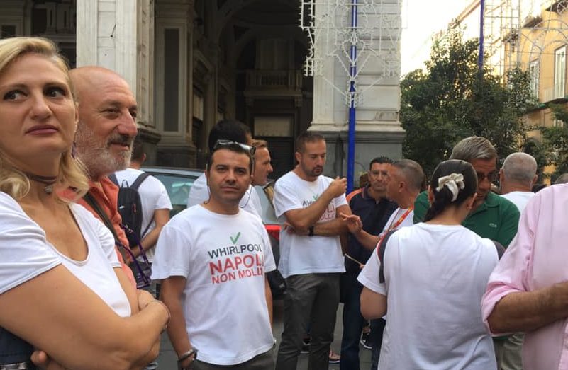 Anche una delegazione di operai della Whirlpool sono in attesa del miracolo: chiedono il salvataggio dei livelli occupazionali. I lavoratori hanno organizzato un sit-in all’esterno del Duomo, indossando tutti una t-shirt con la scritta: “Whirlpool Napoli non molla“.
