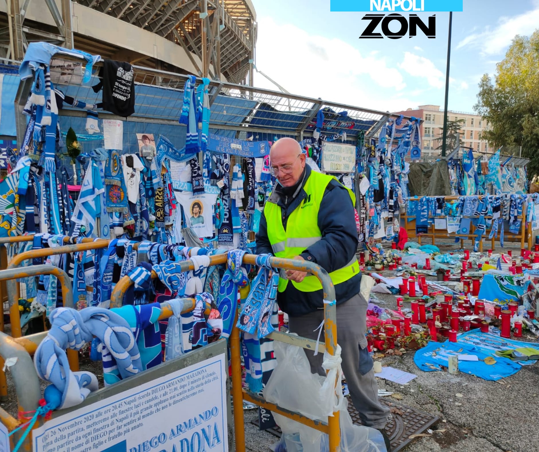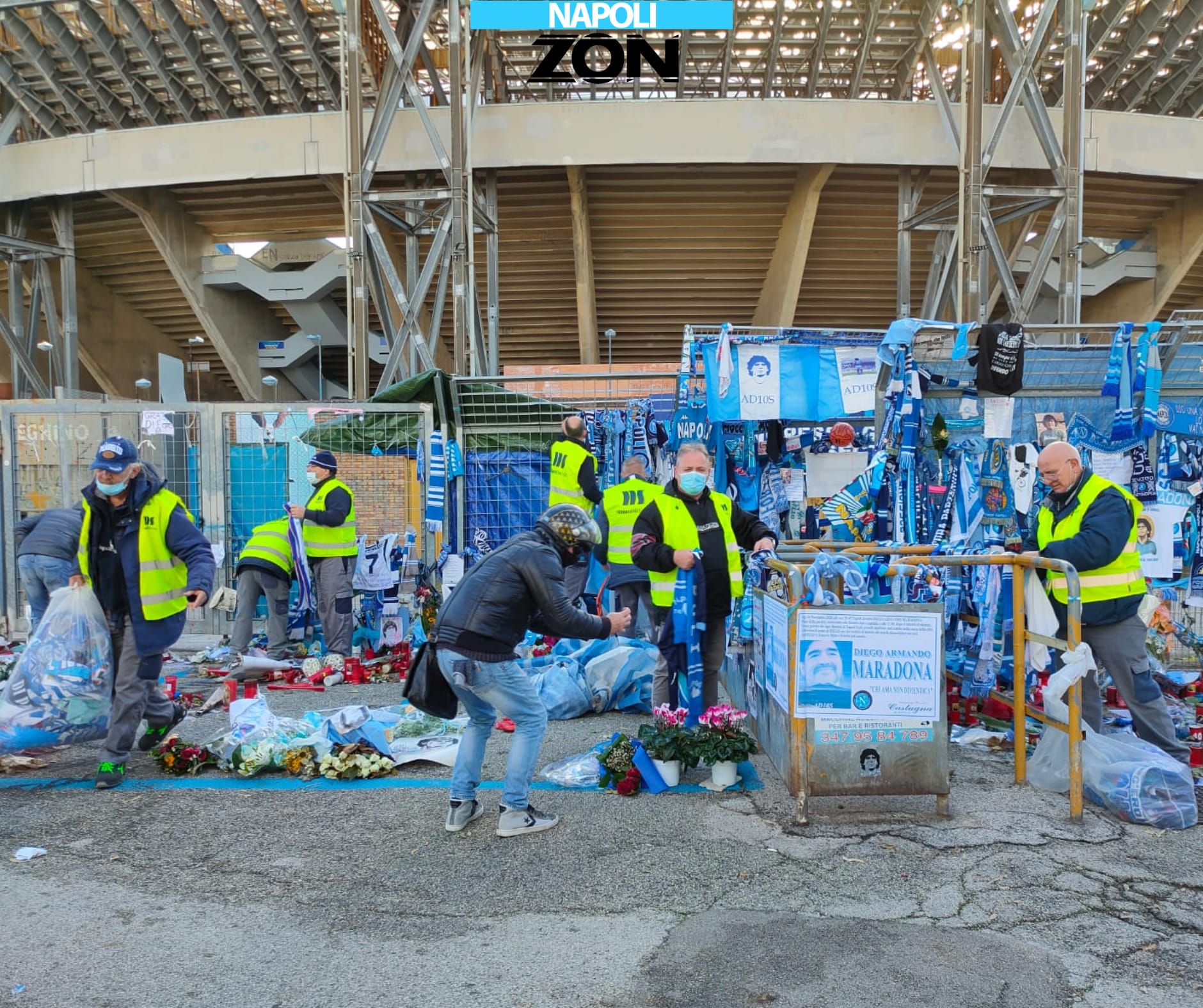 Erano già stati rimossi, ma la fede dei tifosi è più grande. All’esterno dello Stadio Diego Armando Maradona, la Napoli Servizi sta rimuovendo i cimeli per il Pibe de Oro per trasportarli all’interno.