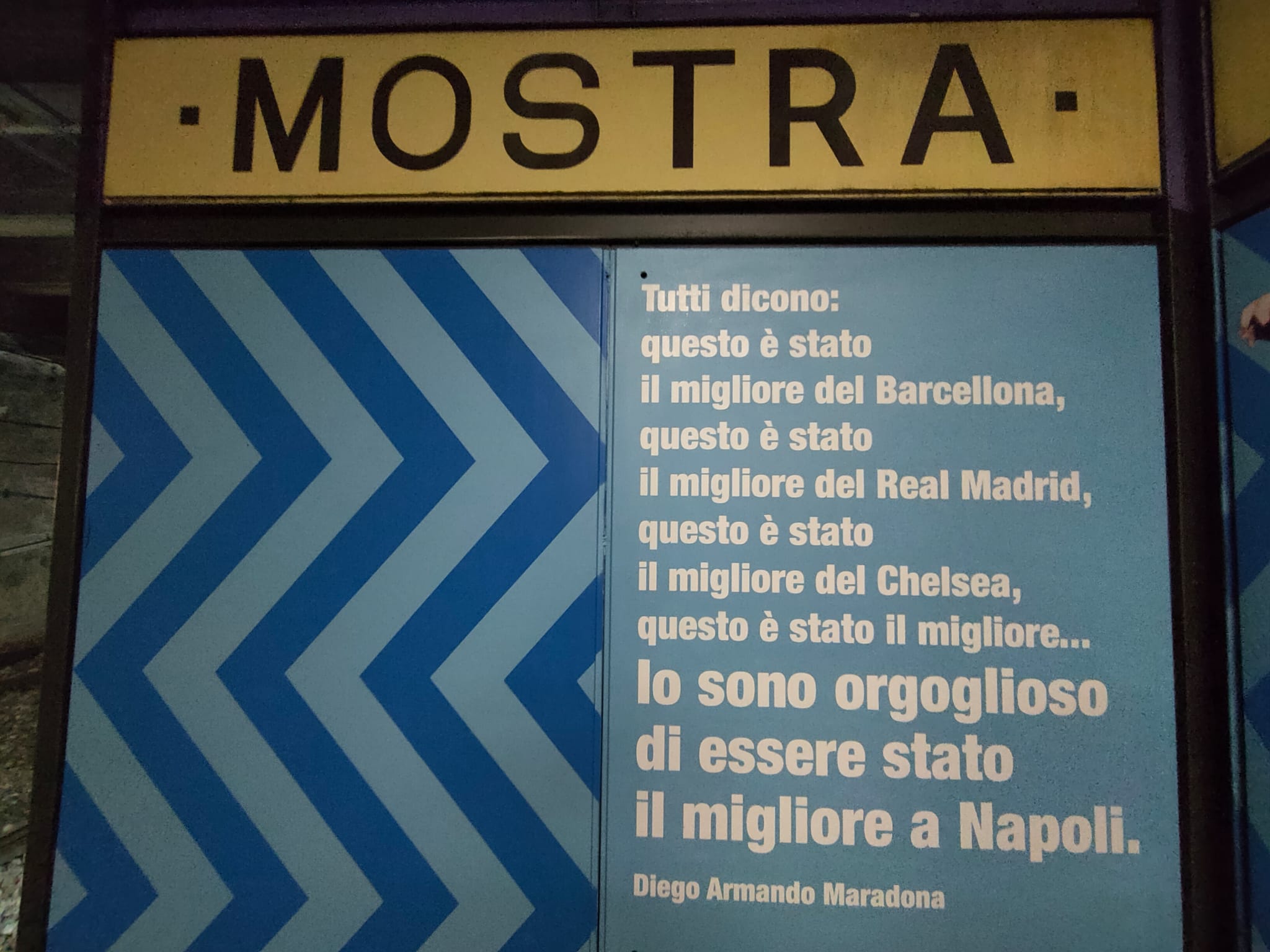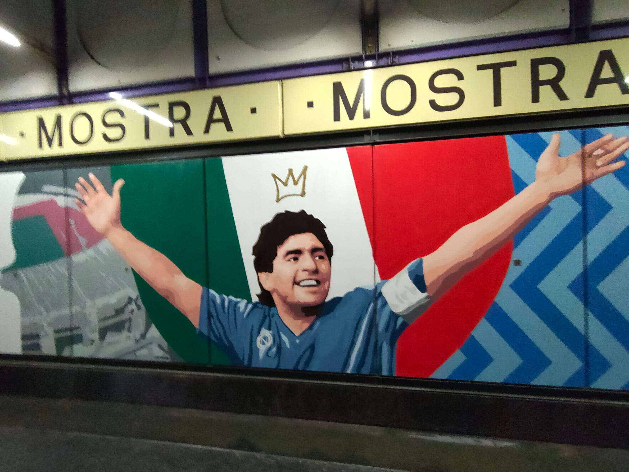 Che sensazione è per lei vedere il Napoli rappresentato nella fermata Mostra? «È stata una sensazione straordinaria quella di passeggiare qui sotto ripercorrendo la storia dal 1926 ai giorni nostri di questo Napoli glorioso reso ancora più glorioso da questa stella che è caduta che è Maradona. Campeggia con la corona in testa come un re, tra i vari murales.»
