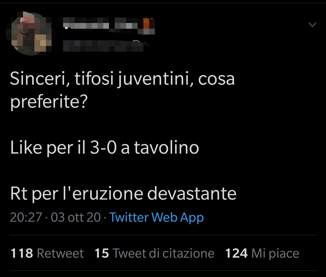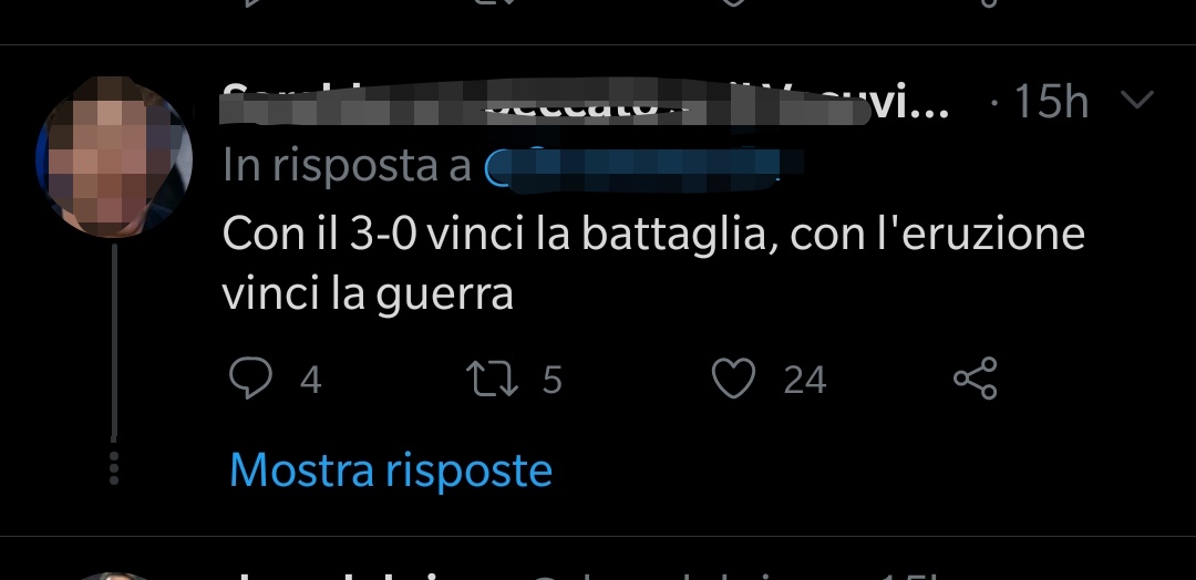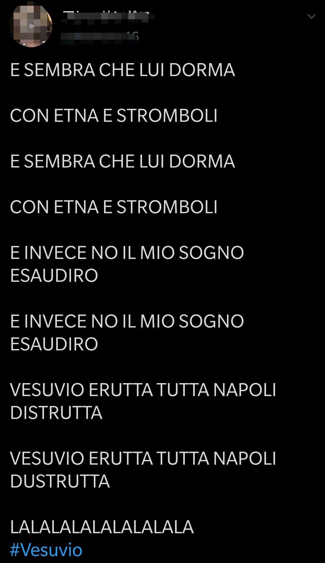 Alcuni tifosi bianconeri, infatti, hanno invocato il vulcano dopo la decisione della squadra partenopea di non partire per Torino. Qualcuno scrive: «Tifosi juventino, cosa preferite? Like per il 3-0 a tavolino, Rt (retweet ndr) per l’eruzione devastante». E in risposta arriva: «con il 3-0 vincete la battaglia, con l’eruzione la guerra».